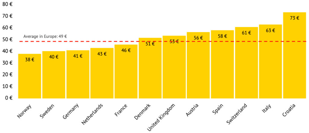Saksassa yö luksussegmentin alueella (ADAC Superplatz) maksaa keskimäärin 57 euroa, mutta monissa suosituissa lomamaissa hinnat ovat huomattavasti korkeammat: Espanjassa 98 euroa, Kroatiassa 95 euroa, Itävallassa 92 euroa ja Italiassa 91 euroa.