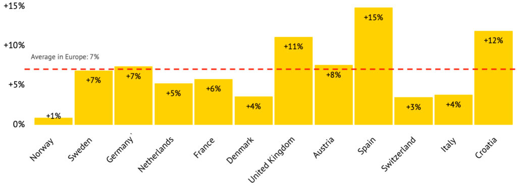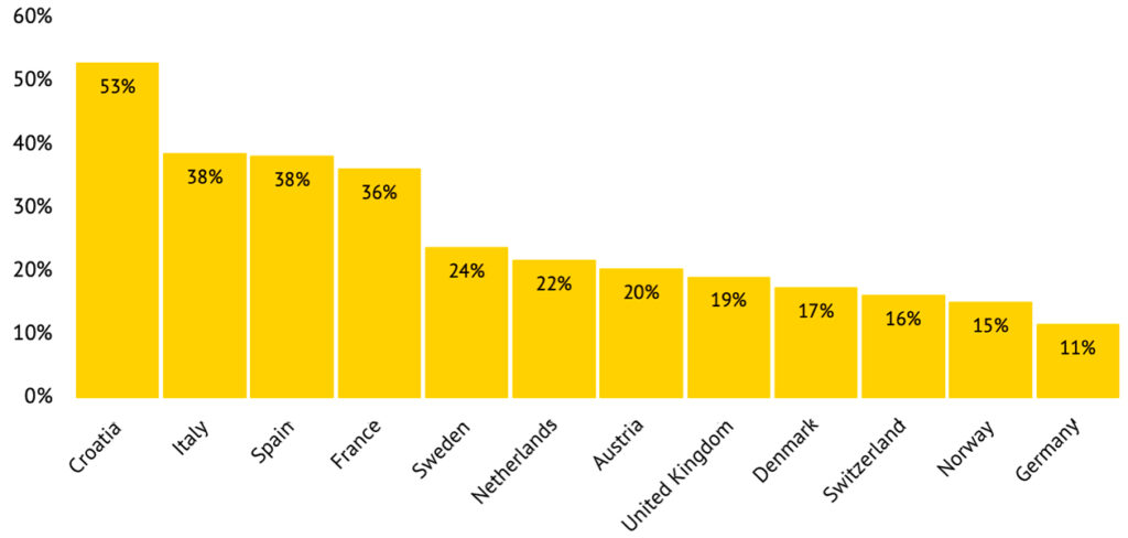 Erityisen suuria lisähintoja sijainnista rannan läheisyydessä maksetaan tulevana sesonkina Ranskassa (+49 %), Espanjassa (+36 %) ja Kroatiassa (+30 %). Saksa on sikäli poikkeus, että yöpyminen rannikkoleirintäalueella maksaa keskimäärin vain noin yhden prosentin enemmän kuin vastaavan tasoisilla sisämaan leirintäalueilla.
