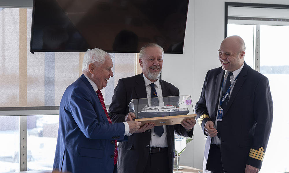 Uumajassa 9.2.2026 järjestetyssä seremoniassa juhlistettiin Stena Linen Wasaline-yrityskaupan virallista toteutumista. Wasalinen toimitusjohtaja Peter Ståhlberg ja Senior Captain Johannes Sjöholm luovuttivat Aurora Botnian pienoismallin Stena Linen omistajalle Dan Sten Olssonille.