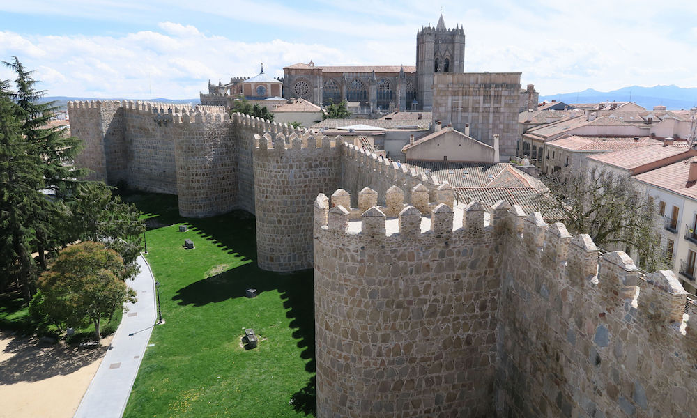 Sitten Ávilaan. Olin kysynyt jo ennen matkaa, missä siellä voi matkailuautolla yöpyä, sillä lähellä ei ollut yhtään leirialuetta. Sain tiedon, että poliisiaseman vieressä on iso kenttä, jossa matkailuautot yöpyvät (koordinaatit 40°39’42.59”/4°42’21.70”). Siitä on lyhyt kävely katedraalille. Ávila on ennen kaikkea tunnettu kaupunkia ympäröivästä muurista. Ykkösenä pidetään Etelä-Ranskassa olevaa Carcassonea. Muuri on rakennettu vuonna 1090, sen pituus on 2516 metriä, ja käveltävää osuutta on noin puolet. Muurissa on 88 tornia, 2500 ampuma-aukkoa, ja sen korkeus on 12 metriä. Muurille voi nousta hyvin katedraalin vierestä.