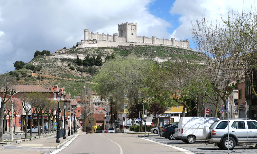 Seuraava linnakohde oli Penafiel. Korkealle mäelle pääsee hyvin matkailuautolla, kunhan löytää ajoreitin. Jouduimme kysymään paikallisilta. Linnan muoto on hyvin poikkeuksellinen, sen pituus on 210 metriä ja leveys vain 20 metriä. Keskellä on mahtava torni, joka kohoaa 34 metriä muun linnan yläpuolelle. Pääsymaksuun sisältyy käynti viinimuseossa. Näköalat ovat upeat!