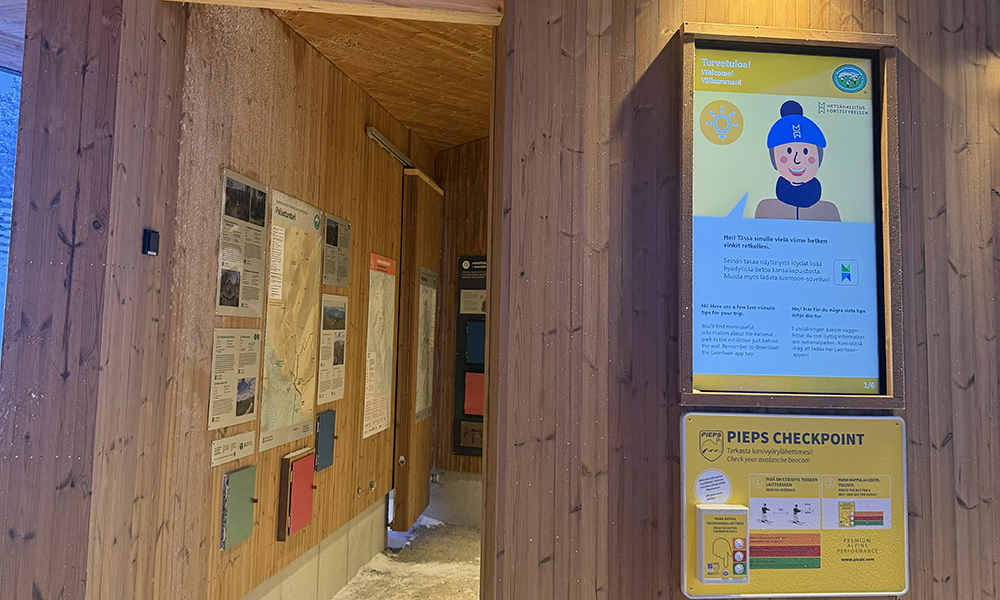 Lähtöportin diginäytöiltä saa tietoa kansallispuiston reiteistä ja palveluvarustuksen kunnosta.