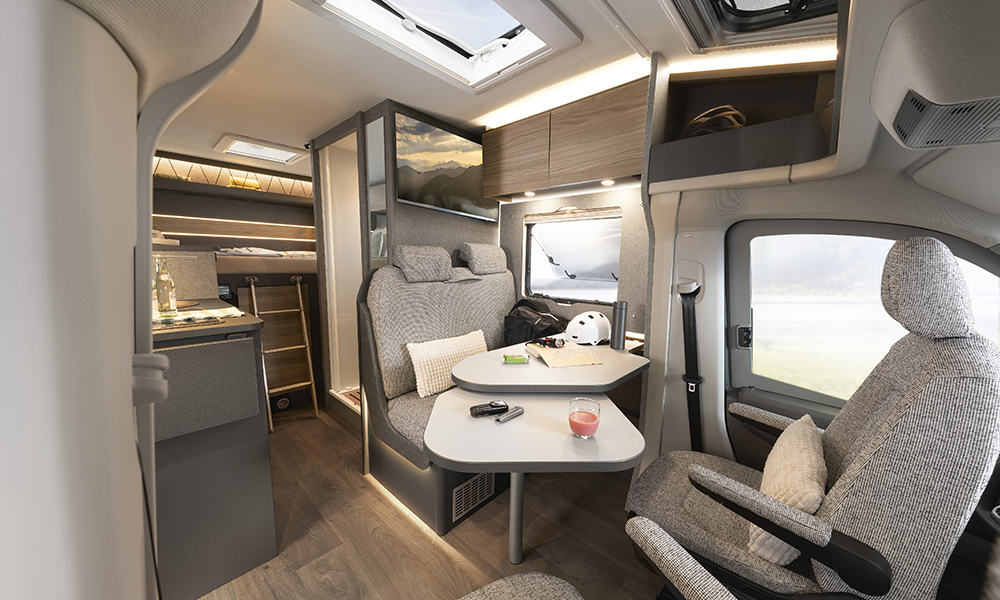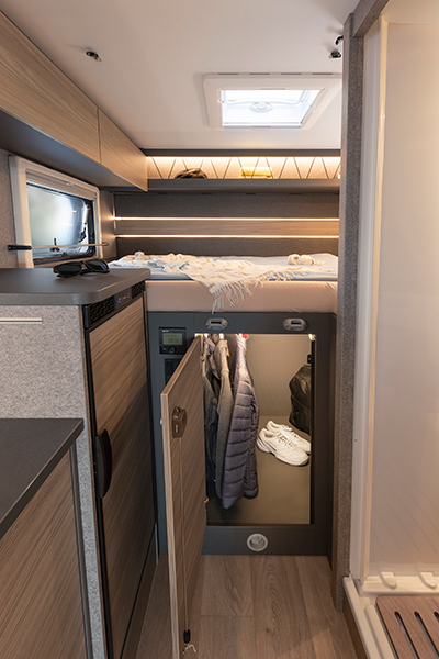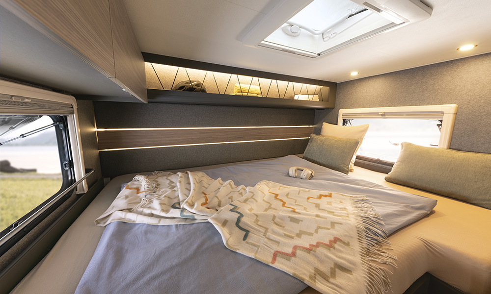 Pariskunnalle mitoitetussa Globebus Performance 4×4 T16 -mallissa on vakiona nukkumispaikat vain kahdelle. Takana olevan poikittaisen parivuoteen mitat ovat 198 x 142/130 senttimetriä. Istuinryhmästä saadaan lisävarusteen avulla tehtyä vielä makuupaikka yhdelle reissaajalle.