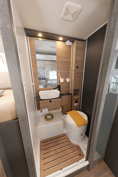 Kylpyhuoneeseen saadaan muovisen kääntyvän seinän avulla myös suihkukoppi. Vedetön Clesana-wc-istuin on saatavilla tehdaslisävarusteena.