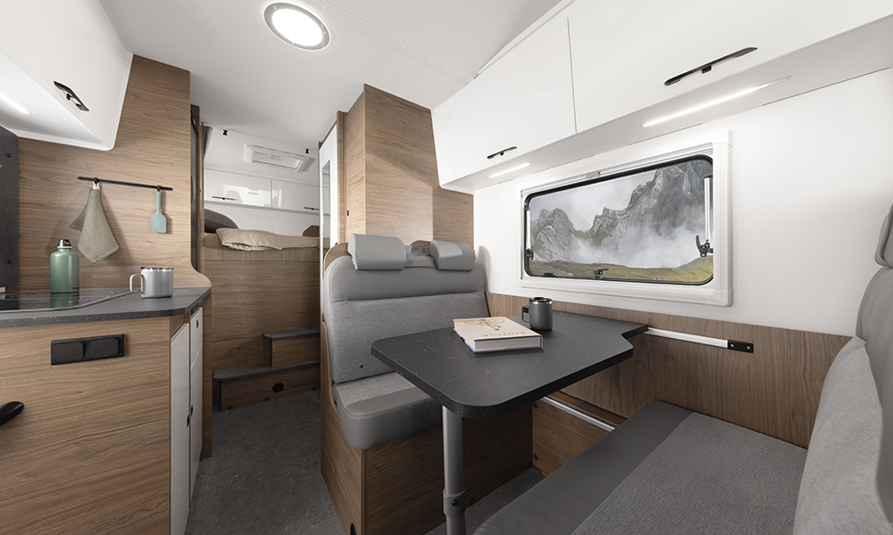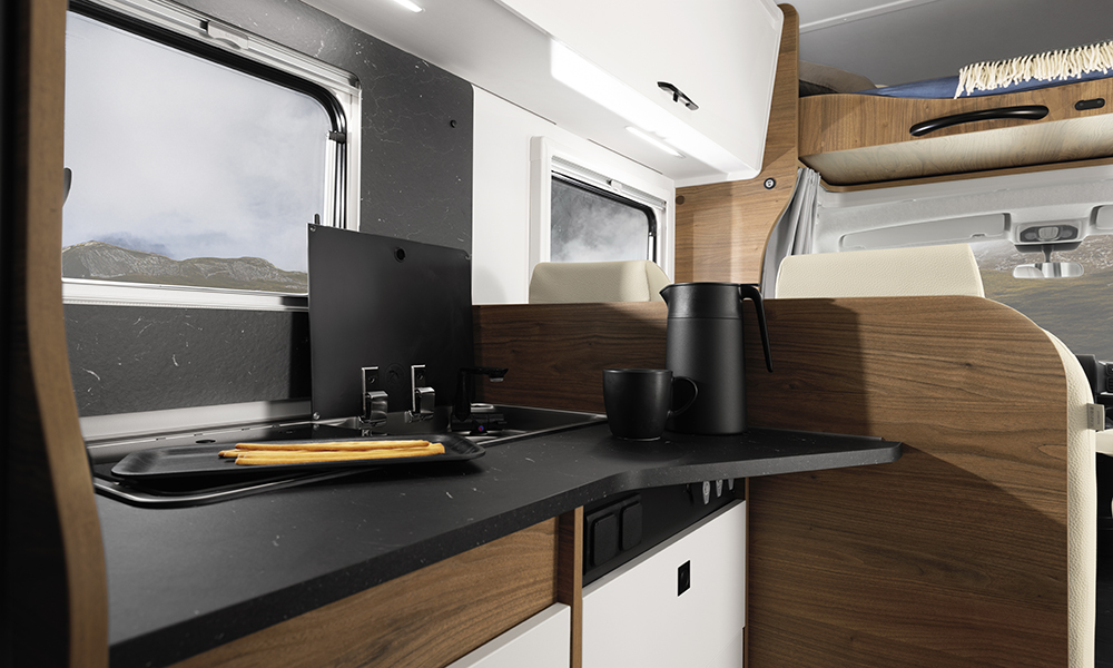 Kummankin vaihtoehdon keittiössä on pakastelokerolla varustettu 135 litran kompressorijääkaappi, kaksiliekkinen liesi sekä säilytys- ja työskentelytilaa. Raikasvesisäiliä on 110-litrainen, harmaavesisäiliö 90-litrainen.
