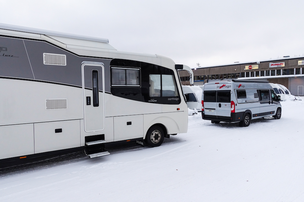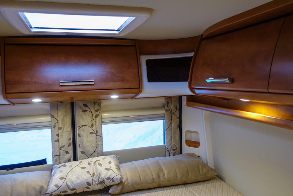 Carthagon säilytystilat riittävät hyvin kahdelle. Edessä ja takana on useita yläkaappeja ja sohvan alla on reilu säilytystila. Myös ohjaamon yläpuolella on tilava luukullinen lokero. Pieniä säilytyslokeroita mm. kengille löytyy lattialuukkujen alta.
