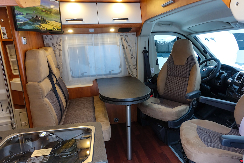 Oleskelutila käsittää kahden hengen sohvan sekä kääntyvät ohjaamon istuimet, keskellään reilun kokoinen pöytälevy. Etuistuimet mahtuvat kääntymään helposti, kun Ducatossa on sisäänpainettava ratti. Tukeva pöytälevy on tummanharmaata hieman kirjavapintaista materiaalia, jossa eivät tahrat heti näy. Pyöreän pöydän pään ohi mahtuu helposti kulkemaan eteen. Tarvittaessa pöydän alta käännetään esiin lisäpala. Näin neljänkin hengen ateriointi sujuu mukavasti. Istuinten verhoiluna niin sohvassa kuin pilotti-istuimissakin on tyylikästä tummahkon harmaata kangasta ja keskiruskeaa mokkaa. Istuinten muotoilu on hyvä.