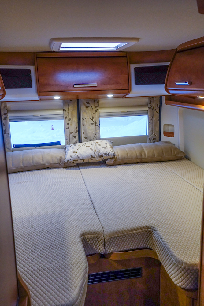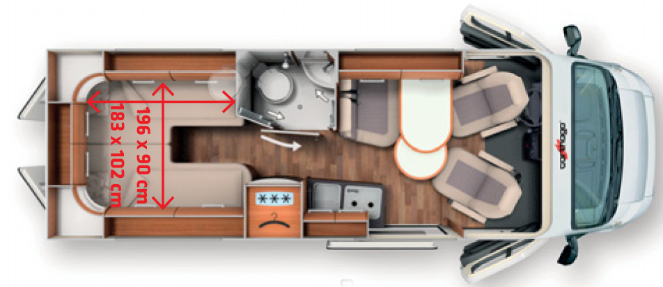 Fiat Ducaton pidempään koriin mahtuu erillisvuoteet pitkittäin, kun lyhyemmässä nukutaan parivuoteessa poikittain. Keskellä autoa on vessa vasemmalla ja keittiö oikealla, edessä oloryhmä.