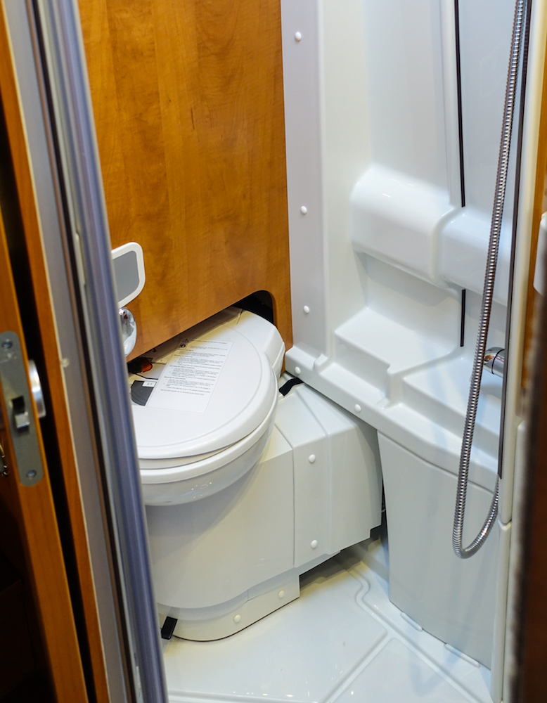 Vessa löytyy keskeltä autoa vasemmalta. Kääntyvä kemiallisen vessan istuin pyörähtää omaan pieneen lokeroonsa kun tilaa käytetään suihkuna. Vessassa on pieni pesuallas, peiliovellinen yläkaappi sekä allaskaappi ja vetolaatikko.