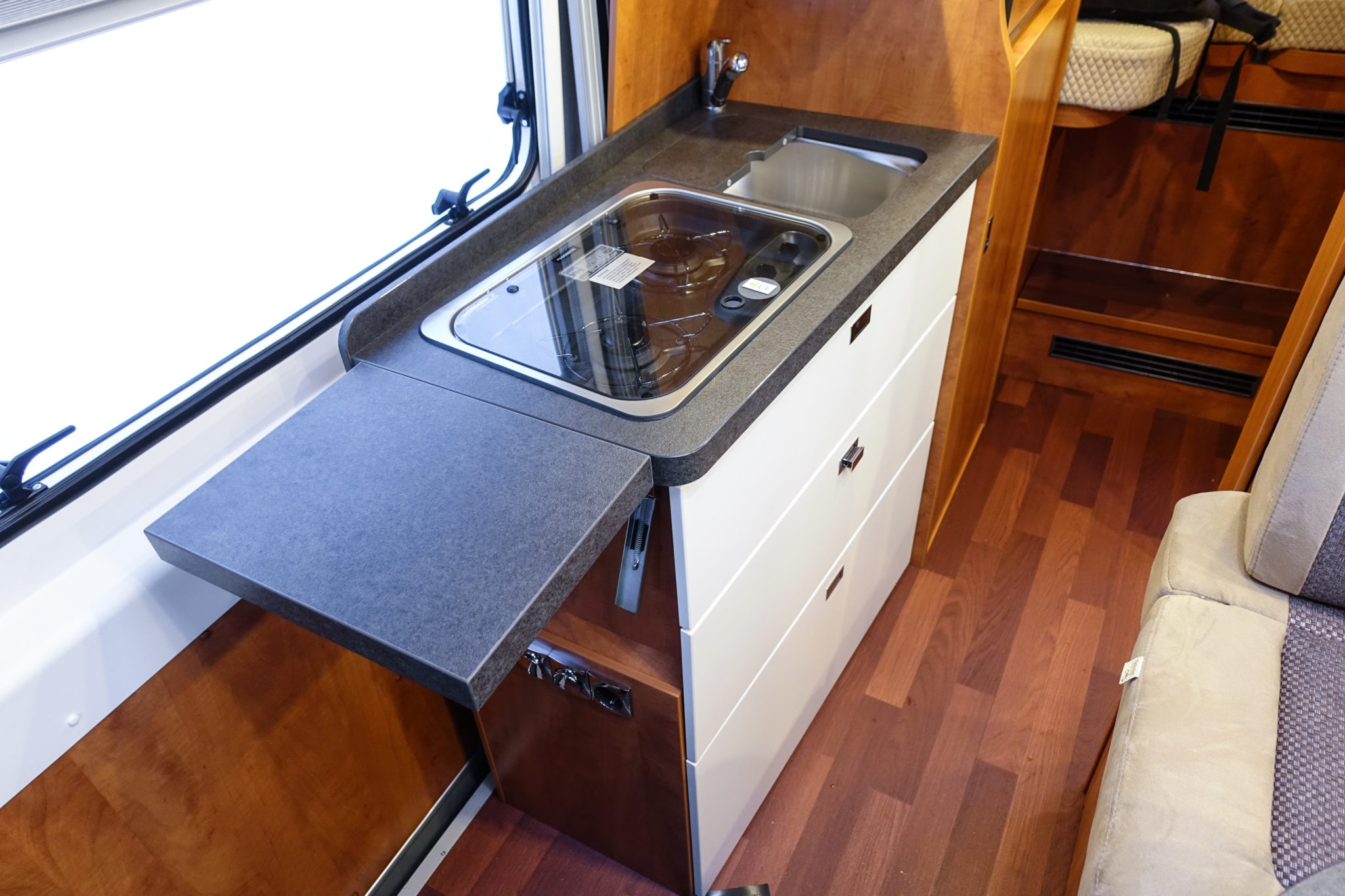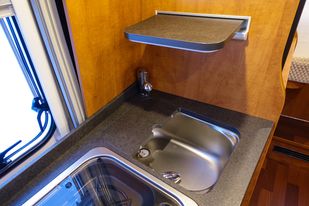 Keittiö on keskellä autoa oikealla, osittain lukuoven edessä. Tiskipöytä on samanlaista vahvaa muovipintaa kuin oloryhmässä. Tiskiin on upotettu teräksinen allas. Se on peitetty kaksiosaisella kannella, jonka kääntöpuolella on leikkuulauta. Seinällä on teline, johon kansi saadaan helposti pieneksi apuhyllyksi. Toinen aputaso aukea tiskipöydän päästä. Kaksiliekkinen kaasuliesi jää lasikannen alle silloin kun ei keitellä. Tiskipöydän tilat riittävät siis moneksi.