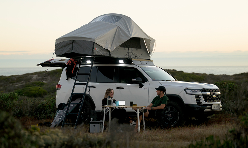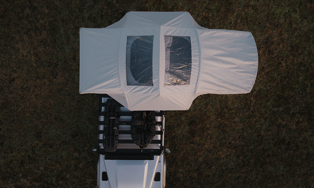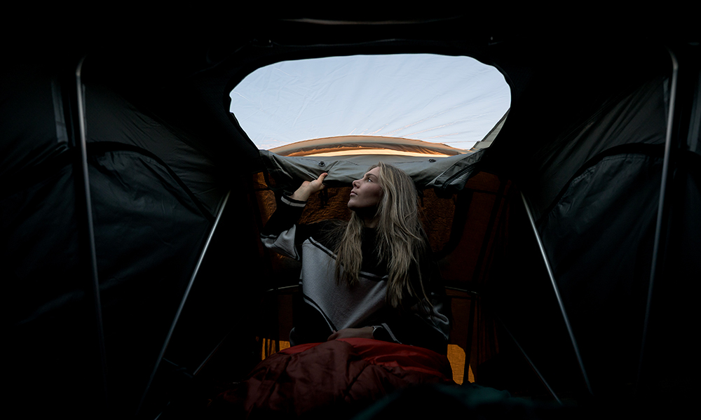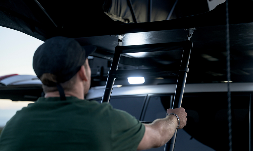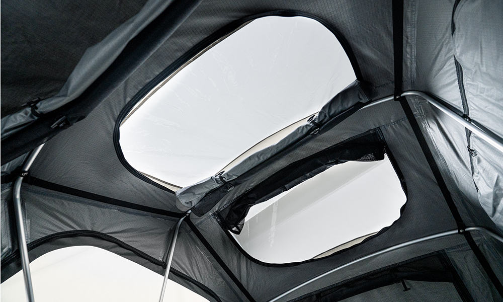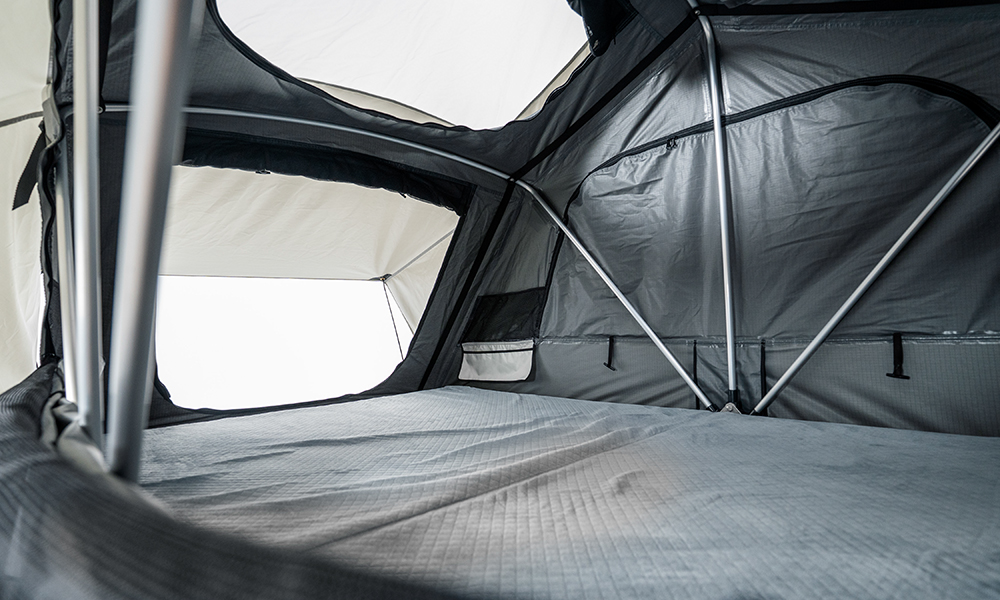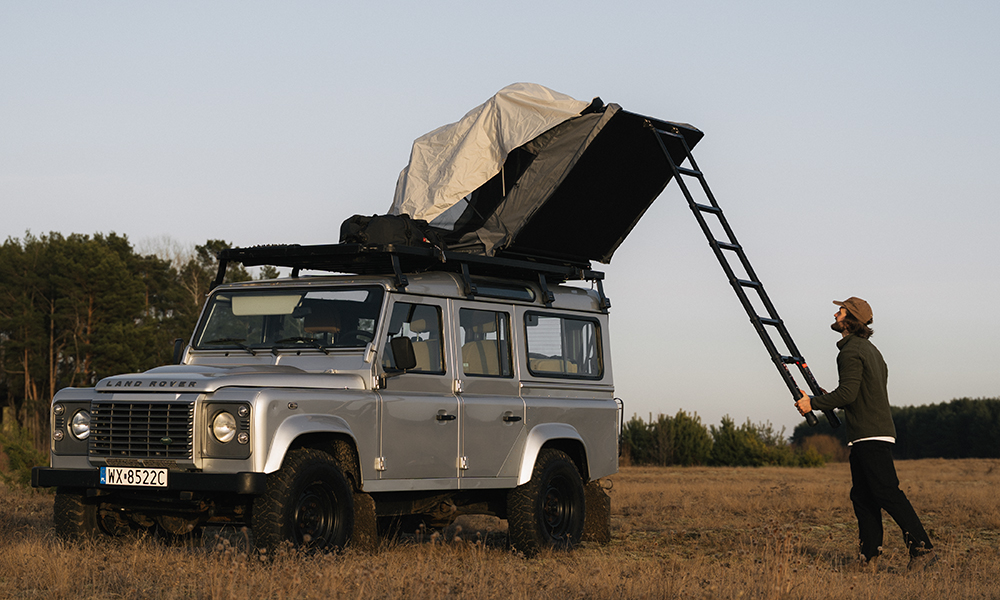 Kattoteltan rakenne mahdollistaa nopean siirtymisen pysäköinnistä leiriytymiseen – avataan vetoketju, vapautetaan lukitukset, avataan teltta ja pidennetään teleskooppitikkaat.